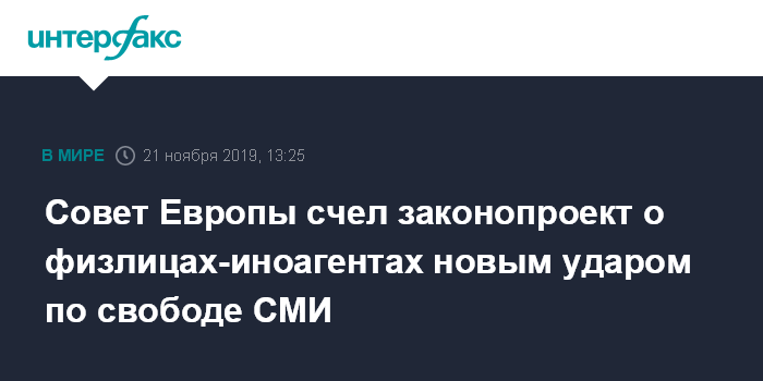 Москва. 21 ноября. INTERFAX.RU - Комиссар Совета Европы по правам человека Дунья Миятович призвала Госдуму не принимать законопроект о физлицах-иноагентах, предупредив, что в случае одобрения данного документа это станет новым серьезным ударом по свободе СМИ и "возможности людей получать и передавать информацию".