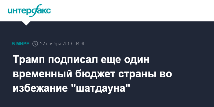 Москва. 22 ноября. INTERFAX.RU - Президент США Дональд Трамп сообщил журналистам, что подписал временный бюджет на 2020 год, который будет действовать до 20 декабря.