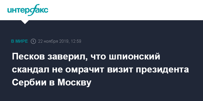 Москва. 22 ноября. INTERFAX.RU - Пресс-секретарь президента РФ Дмитрий Песков в пятницу подтвердил подготовку к визиту в Москву президента Сербии Александра Вучича, подчеркнув, что обнародование информации о шпионском скандале его не омрачит.