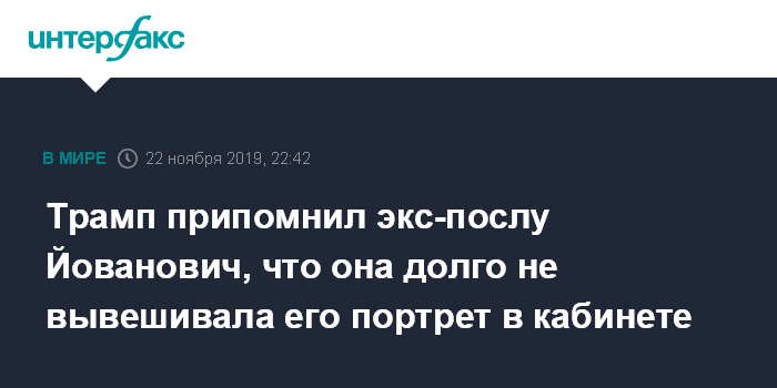 Москва. 22 ноября. INTERFAX.RU - Президент США Дональд Трамп в ходе телефонного включения в эфире телеканала FoxNews вспомнил тот факт, что экс-посол США на Украине Мари Йованович долго не хотела вешать в американском посольстве его портрет, добавив, что "эта женщина не была ангелом".