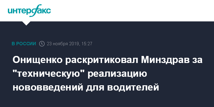 "Это нужно сделать. Мы берем самую опасную когорту населения, люди за рулем, машина - объект повышенной опасности. А мы почему-то сразу говорим о том, что врачи плохие. Конечно, Минздраву тоже нужно объявить выговор - затеяли такую хорошую кампанию, но ее нужно соответствующим образом сопроводить (обеспечить надлежащее воплощение), а не бухнуть приказом и дать повод этим разговорам", - сказал он "Интерфаксу" в субботу.