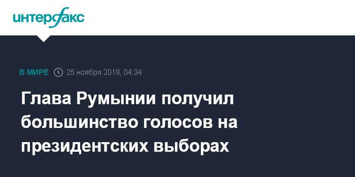 Москва. 25 ноября. INTERFAX.RU - Действующий президент Румынии Клаус Йоханнис одерживает уверенную победу над бывшим премьер-министром Виорикой Данчилэ, свидетельствуют результаты голосования после подсчета примерно 98% бюллетеней.