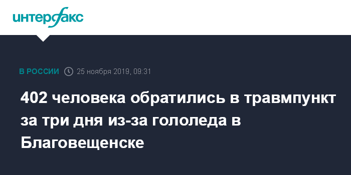 "За три дня в Благовещенске значительно возросло число граждан, получивших травмы при падении на улице. С 22 по 24 ноября за помощью к специалистам травмпункта обратились 402 человека (из них 45 детей). Большинство из них получили ушибы, растяжения, переломы при падении на скользких участках тротуаров", - отметили в Минздраве Приамурья.