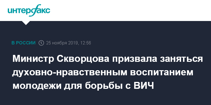 Москва. 25 ноября. INTERFAX.RU - Глава Минздрава Вероника Скворцова считает необходимым духовно-нравственное воспитание молодежи, ее просвещение и повышение информированности о ВИЧ-инфекции для борьбы с распространением ВИЧ. Она заявила это на форуме по профилактике и лечению ВИЧ/СПИДа.