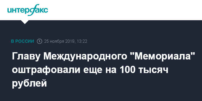 Москва. 25 ноября. INTERFAX.RU - Председатель правления Международного "Мемориала" Ян Рачинский оштрафован еще на 100 тысяч рублей, сообщили в организации.