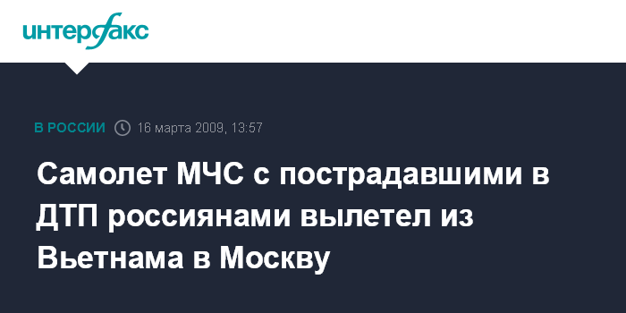 Хошимин. 16 марта. INTERFAX.RU - Самолет МЧС России, на борту которого находятся пострадавшие в ДТП во Вьетнаме российские туристы и сопровождающие их медики, вылетел в понедельник из аэропорта Хошимина и направляется в Москву.