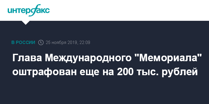 1 ноября Международный "Мемориал" вслед за правозащитным центром "Мемориал" был оштрафован на 300 тысяч рублей за несоблюдение закона об иноагентах.