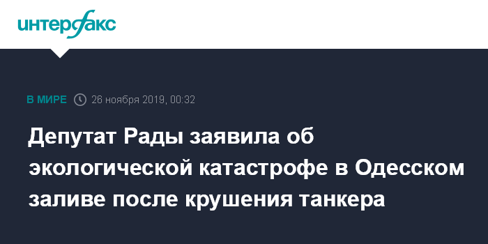 Москва. 26 ноября. INTERFAX.RU - Украинские власти должны немедленно организовать работы по предотвращению экологической катастрофы в Одессе после кораблекрушения судна "Делфи" (Delfi), такое мнение выразила народный депутат от фракции "Оппозиционная платформа - за жизнь" Татьяна Плачкова в фейсбуке.