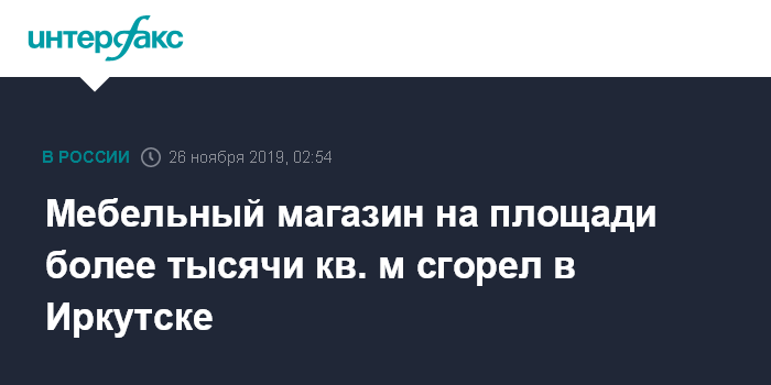 Москва. 26 ноября. INTERFAX.RU - Пожар произошел утром во вторник в мебельном магазине "Мебель град" в Иркутске, сообщила пресс-служба главного управления МЧС по региону.