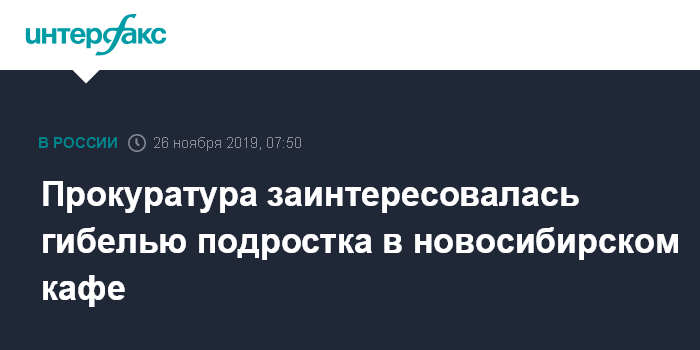 Москва. 26 ноября. INTERFAX.RU - Прокуратура Октябрьского района Новосибирска организовала проверку в связи с гибелью несовершеннолетнего в кафе в Железнодорожном районе города, сообщает областная прокуратура.