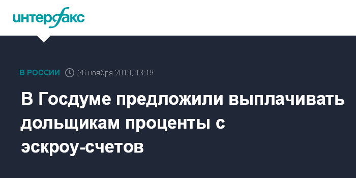 Москва. 26 ноября. INTERFAX.RU - Законопроект, который позволит дольщикам получать доход в виде процентов от размещенных средств на счетах эскроу, внесен в Госдуму.