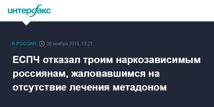 Москва. 26 ноября. INTERFAX.RU - Европейский суд по правам человека (ЕСПЧ) отказал в удовлетворении жалобы трех россиян на отказ врачей лечить их на родине от наркомании методом "метадоновой терапии" (назначение метадона взамен употребляемого наркотика), сообщили в пресс-службе министерства юстиции РФ.