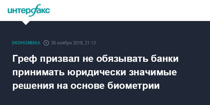 Москва. 26 ноября. INTERFAX.RU - Законодательно обязывать банки использовать биометрическую идентификацию граждан для принятия юридически значимых решений не стоит, считает глава Сбербанка России Герман Греф.