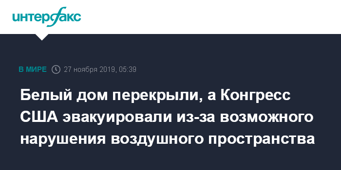 Москва. 27 ноября. INTERFAX.RU - Территория Белого дома была перекрыта, а конгресс США эвакуирован из-за возможного нарушения воздушного пространства, сообщают американские СМИ.