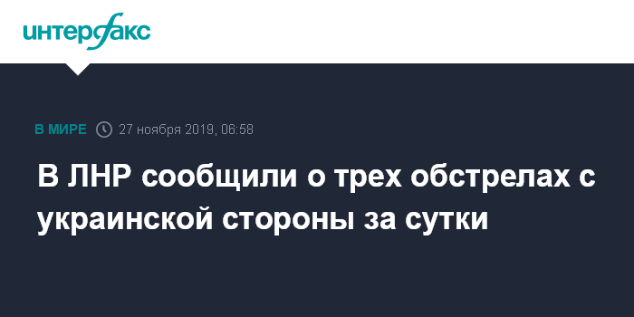 Москва. 27 ноября. INTERFAX.RU - Вооруженные силы Украины три раза за прошедшие сутки обстреляли территорию самопровозглашенной Луганской народной республики, сообщили "Интерфаксу" в представительстве ЛНР в Совместном центре по контролю и координации режима прекращения огня (СЦКК).