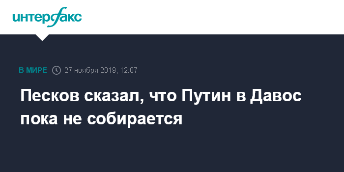 Москва. 27 ноября. INTERFAX.RU - В планах президента Владимира Путина пока не значится поездка на Всемирный экономический форум в Давосе в январе 2020 года. Об этом сказал пресс-секретарь главы государства Дмитрий Песков.