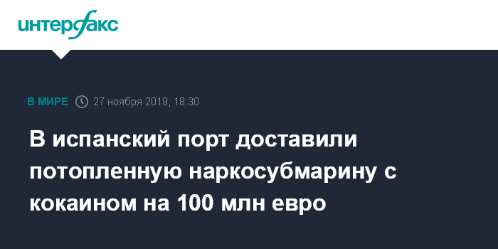 Москва. 27 ноября. INTERFAX.RU - Сотрудники гражданской гвардии Испании и таможенной службы в среду приняли участие в поднятии затонувшей в воскресенье самодельной 20-метровой подводной лодки с грузом наркотиков и ее доставке в порт города Альдан в Галисии, сообщает испанский телерадиоканал РТВЕ.
