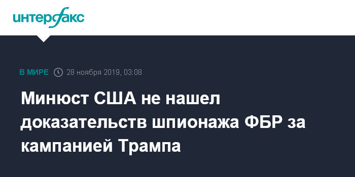 Москва. 28 ноября. INTERFAX.RU - Генеральный инспектор Министерства юстиции Майкл Горовиц не нашел никаких доказательств того, что ФБР пыталось разместить своих информаторов внутри кампании Дональда Трампа в 2016 году для расследования предположительного вмешательства России в президентские выборы, сообщает The New York Times со ссылкой на осведомленные источники.