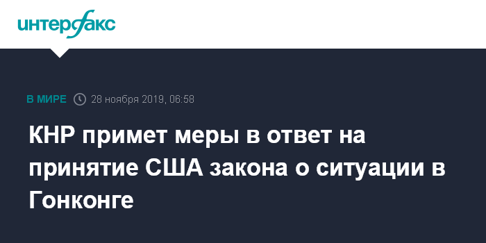 Москва. 28 ноября. INTERFAX.RU - Китай предупредил США, что может принять соответствующие контрмеры в ответ на принятие закона "О правах человека и демократии в Гонконге", ответственность за их последствия будет лежать на американской стороне, заявил в четверг МИД КНР.