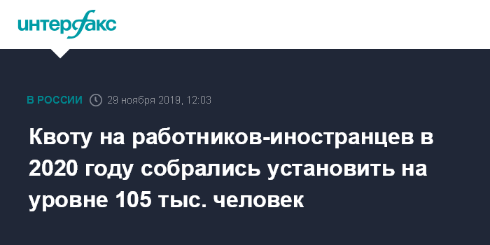 Москва. 29 ноября. INTERFAX.RU - В правительстве предлагают установить квоты на привлечение иностранных работников в Россию в 2020 году в объеме почти 105 тысяч человек, сообщила вице-премьер Татьяна Голикова.