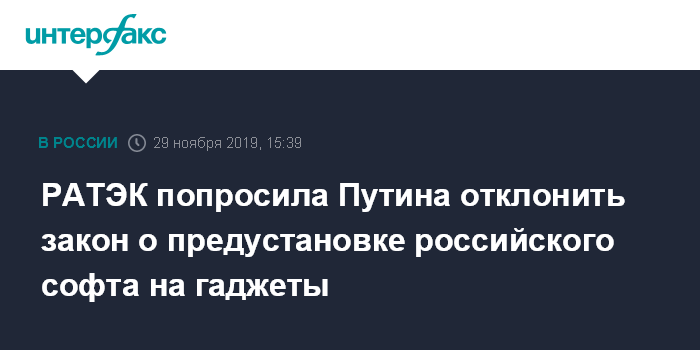 Москва. 29 ноября. INTERFAX.RU - Ассоциация продавцов и производителей бытовой техники и компьютеров (РАТЭК) попросила президента Владимира Путина не подписывать закон об обязательной предустановке российского программного обеспечения на гаджеты. У "Интерфакса" есть копия этого обращения.