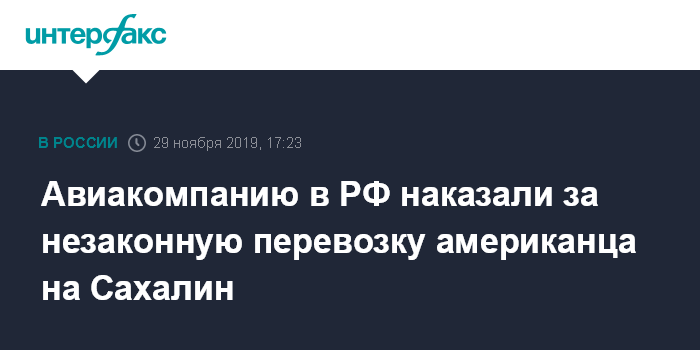 Москва. 29 ноября. INTERFAX.RU - Военные прокуроры провели проверку по факту незаконной перевозки гражданина США из Японии в Россию в минувшем октябре, в итоге авиакомпании и иностранному путешественнику назначили штрафы.