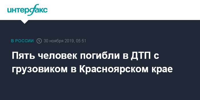 Москва. 30 ноября. INTERFAX.RU - В результате дорожно-транспортного происшествия, произошедшего в Уярском районе Красноярского края, погибли пять человек, сообщается на сайте регионального главка МВД.