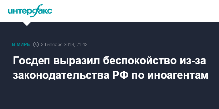 Москва. 30 ноября. INTERFAX.RU - Одобрение в РФ новых мер, касающихся иноагентов, вызывает тревогу, заявили в субботу в госдепартаменте США.