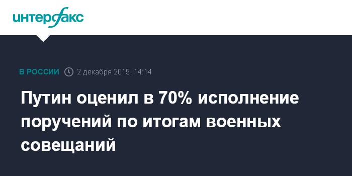 "По итогам предыдущих встреч в таком формате было дано несколько сотен поручений. В целом исполняются удовлетворительно. 70% - исполнено, остальные все находятся в разных стадиях исполнения. Это очень важно", - сказал Путин в понедельник при открытии серии военных совещаний в Сочи.