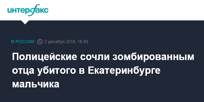 Москва. 2 декабря. INTERFAX.RU - Отца мальчика, найденного мертвым в Екатеринбурге, задержали на железнодорожном вокзале в Уфе, он выглядел зомбированным, сообщил руководитель пресс-службы ГУ МВД по Свердловской области Валерий Горелых.