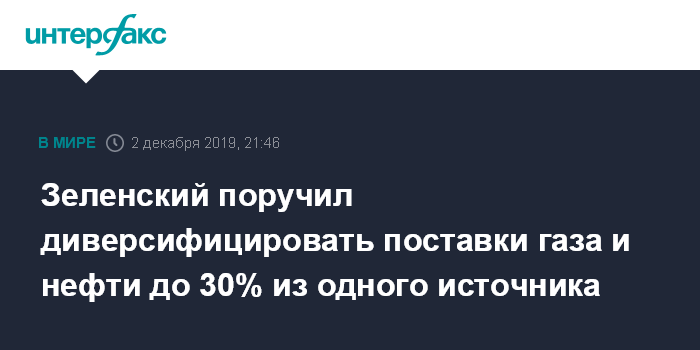 Москва. 2 декабря. INTERFAX.RU - Президент Украины Владимир Зеленский своим указом в понедельник поручил правительству диверсифицировать поставки основных энергоносителей (кроме ядерного топлива) с условием не более 30% из одного источника.