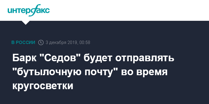 Москва. 2 декабря. INTERFAX.RU - Во время кругосветного плавания с борта парусника "Седов" будет практически ежедневно отправляться "бутылочная почта", сообщила в понедельник журналистам член Морской коллегии при правительстве России, директор Музея Мирового океана Светлана Сивкова.