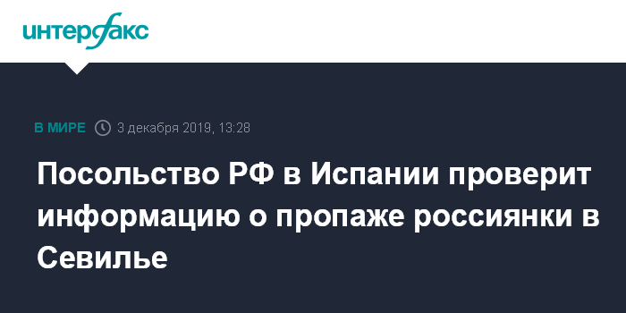 Москва. 3 декабря. INTERFAX.RU - Российские дипломаты проверяют сообщения об исчезновении в испанском городе Севилья на юге страны гражданки РФ.