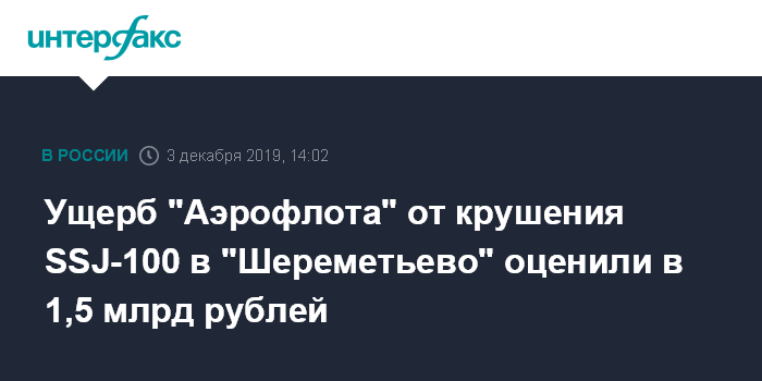 Москва. 3 декабря. INTERFAX.RU - Ущерб компании "Аэрофлот" от крушения самолета SSJ-100 в мае 2019 года в аэропорту "Шереметьево" оценен в 1,5 млрд рублей.