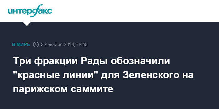 Москва. 3 декабря. INTERFAX.RU - Украинские парламентские фракции "Европейская солидарность", "Батькивщина" и "Голос" обнародовали совместное заявление о необходимости соблюдения президентом Украины Владимиром Зеленским на переговорах в "нормандском формате" "красных линий".