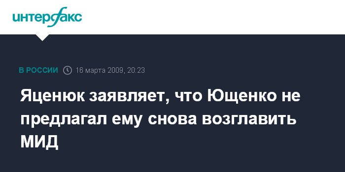Киев. 16 марта. INTERFAX.RU - Президент Украины Виктор Ющенко не предлагал лидеру общественной инициативы "Фронт перемен", экс-министру иностранных дел Арсению Яценюку снова возглавить МИД.