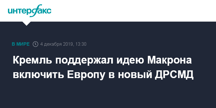 Москва. 4 декабря. INTERFAX.RU - В Кремле поддерживают идею президента Франции Эммануэля Макрона о включении Европы в структуру нового Договора о ракетах средней и меньшей дальности (ДРСМД), заявил пресс-секретарь президента РФ Дмитрий Песков.
