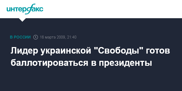 Киев. 16 марта. ИНТЕРФАКС-УКРАИНА - Лидер всеукраинского объединения "Свобода" Олег Тягнибок заявляет о готовности участвовать в президентских выборах.