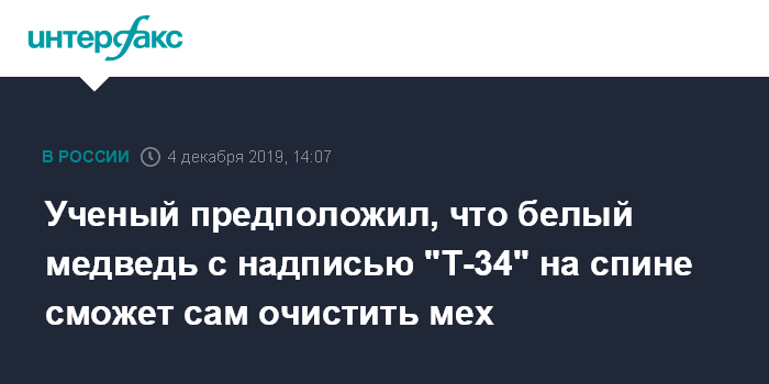 Москва. 4 декабря. INTERFAX.RU - В институте биопроблем Севера Дальневосточного отделения (ДВО) РАН считают, что замеченный на Чукотке белый медведь с надписью "Т-34" на спине переживет этот инцидент без последствий для здоровья и сможет самостоятельно очистить шкуру.
