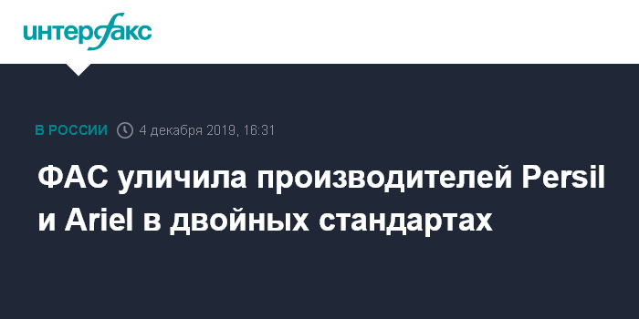 Москва. 4 декабря. INTERFAX.RU - Федеральная антимонопольная служба (ФАС) обнаружила в действиях поставщиков капсул для стиральных машин Persil и Ariel признаки недобросовестной конкуренции - реализуемая в России продукция отличается от той, что продается в странах Западной Европы.