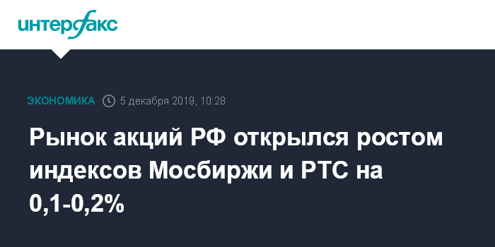 Москва. 5 декабря. INTERFAX.RU - Рынок акций РФ на старте торгов в четверг сохранил восходящую динамику голубых фишек на фоне роста мировых фондовых площадок, вызванного надеждами на торговую сделку первой фазы между США и Китаем; индексы РТС и Мосбиржи за минуту торгов прибавили 0,1-0,2%.