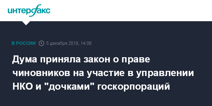 Госдума РФ приняла закон о праве чиновников входить в органы управления "дочек" госкомпанийМосква. 5 декабря. ИНТЕРФАКС -