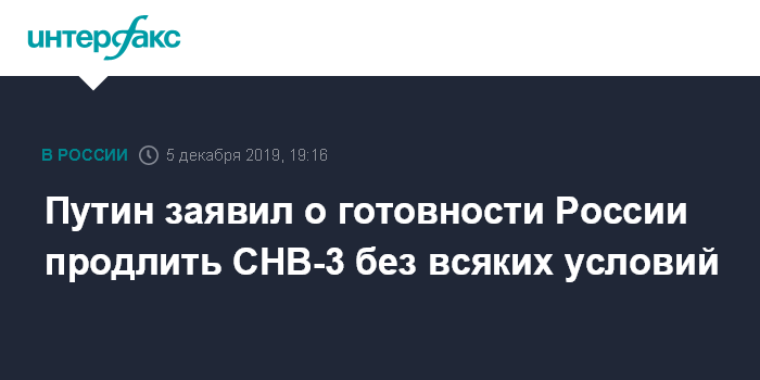 "Хочу еще раз подтвердить позицию Российской Федерации. Россия готова незамедлительно, как можно быстрее, прямо до конца текущего года, без всяких предварительных условий продлить Договор СНВ-3, чтобы не было потом никакого двойного, тройного толкования по поводу нашей позиции. Говорю это официально", - сказал Путин в четверг на завершающем из традиционной серии совещании по военной тематике.