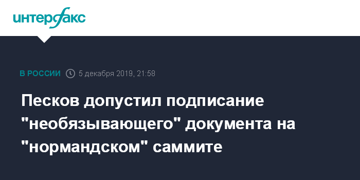 Москва. 5 декабря. INTERFAX.RU - В Москве есть сдержанный оптимизм относительно перспектив российско-украинских отношений в связи с предстоящим в Париже саммитом в нормандском формате, по его итогам может быть принят документ необязывающего характера, сообщил пресс-секретарь президента РФ Дмитрий Песков.