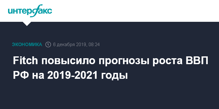 Москва. 6 декабря. INTERFAX.RU - Международное рейтинговое агентство Fitch повысило прогноз роста ВВП России на 2019 год с ожидавшихся в сентябре 1,2% до 1,4%.
