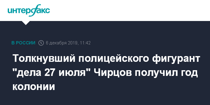 Согласно фабуле дела, Чирцов 27 июля в Столешниковом переулке в центре Москвы толкнул полицейского в область груди и плеча, из-за чего тот испытал боль.