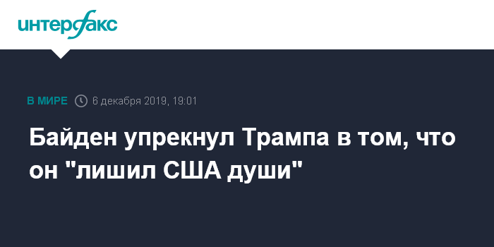Москва. 6 декабря. INTERFAX.RU - Бывший вице-президент США Джо Байден в пятницу раскритиковал работу Дональда Трампа на посту президента Соединенных Штатов, заявив, что лишает страну "души", сообщают американские СМИ.