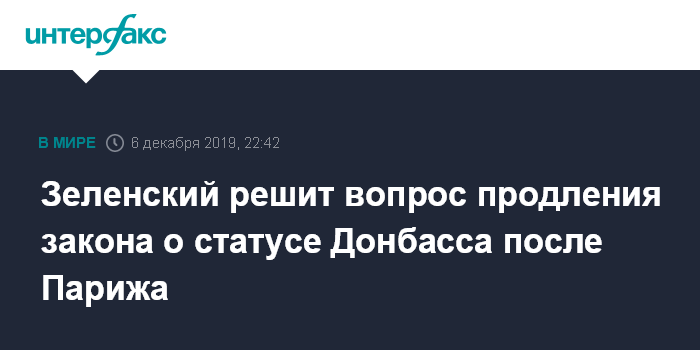 Москва. 6 декабря. INTERFAX.RU - Президент Украины Владимир Зеленский заявил, что вопрос продления закона об особом порядке местного самоуправления в отдельных районах Донецкой и Луганской областей будет решаться в зависимости от итогов встречи в Нормандском формате в Париже 9 декабря.