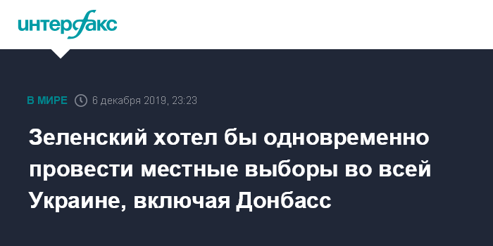 Москва. 6 декабря. INTERFAX.RU - Президент Украины Владимир Зеленский заявил, что Киев хотел бы провести местные выборы на всей территории страны одновременно, включая неподконтрольные районы Донецкой и Луганской областей.