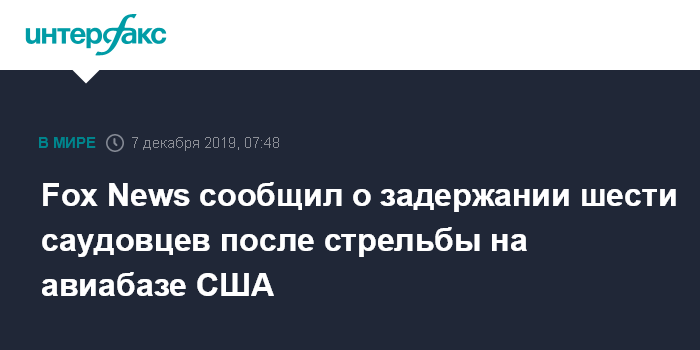 Москва. 7 декабря. INTERFAX.RU - Шесть подданных Саудовской Аравии были задержаны после стрельбы на американской авиабазе во Флориде, в результате которой погибли четверо человек, сообщает Fox News со ссылкой на чиновника.